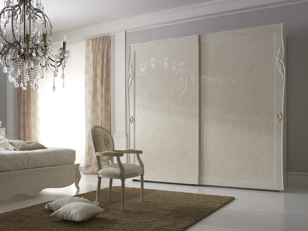 Wardrobe with two sliding doors. Wood structure, with handcrafted decorations.