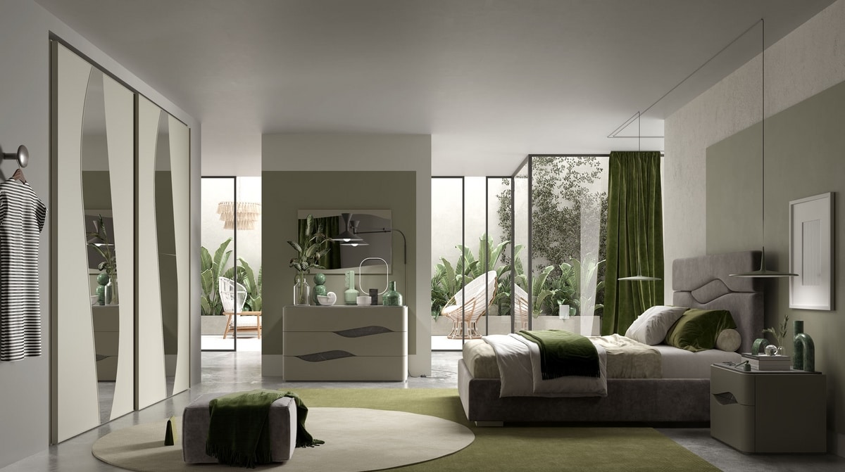 The wardrobe is characterized by its wave mirrors that highlight the two sliding doors and its particular interior designed to accommodate every need!