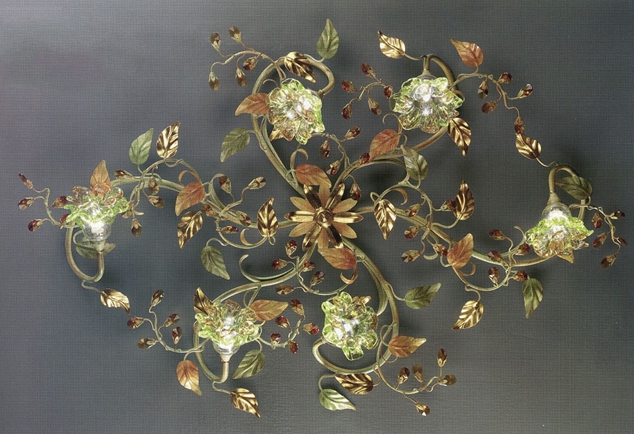6 lights G9 ceiling lamp max 40 watt / shaded ivory finish, green salmon tempera, antique gold leaf / transparent Murano light diffusers green / amber green Scholer crystals. Structure dimensions length 90 cm width 58 cm.