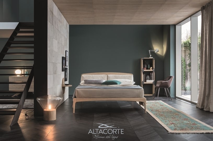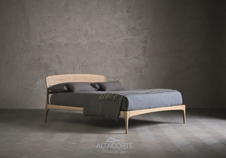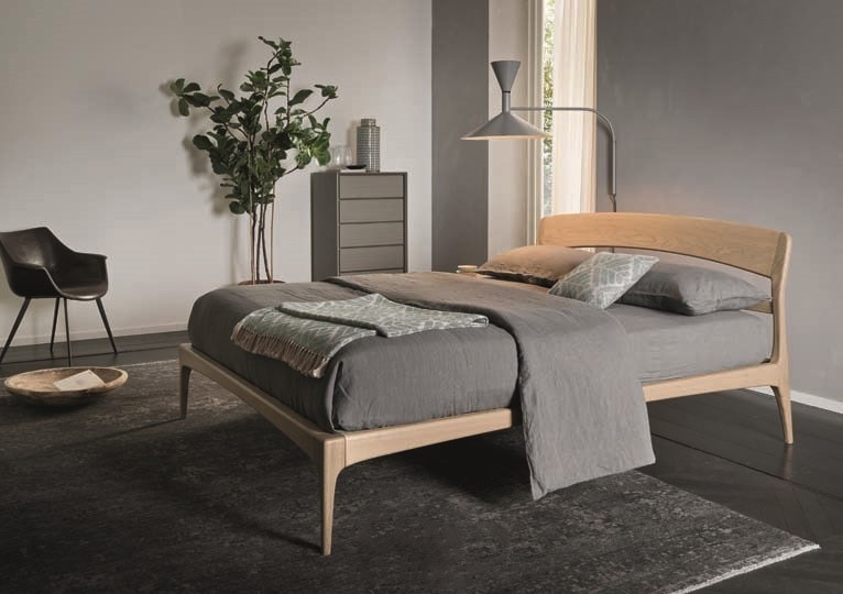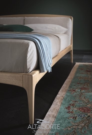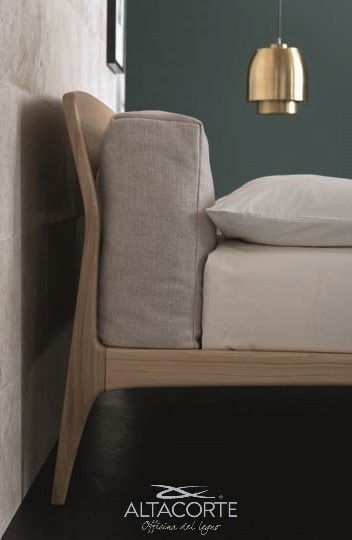 The bed Nice is entirely realized in solid European oak wood with wood inserts machined from a solid and side rails and footboard with a sophisticated curved shape, achievable only through a handicraft precision machining. Available in two variations “Short” and “Long”, in the latter a couple of pillows filled with feathers and polyester flakes covered with removable fabric, leather or eco-leather are included.