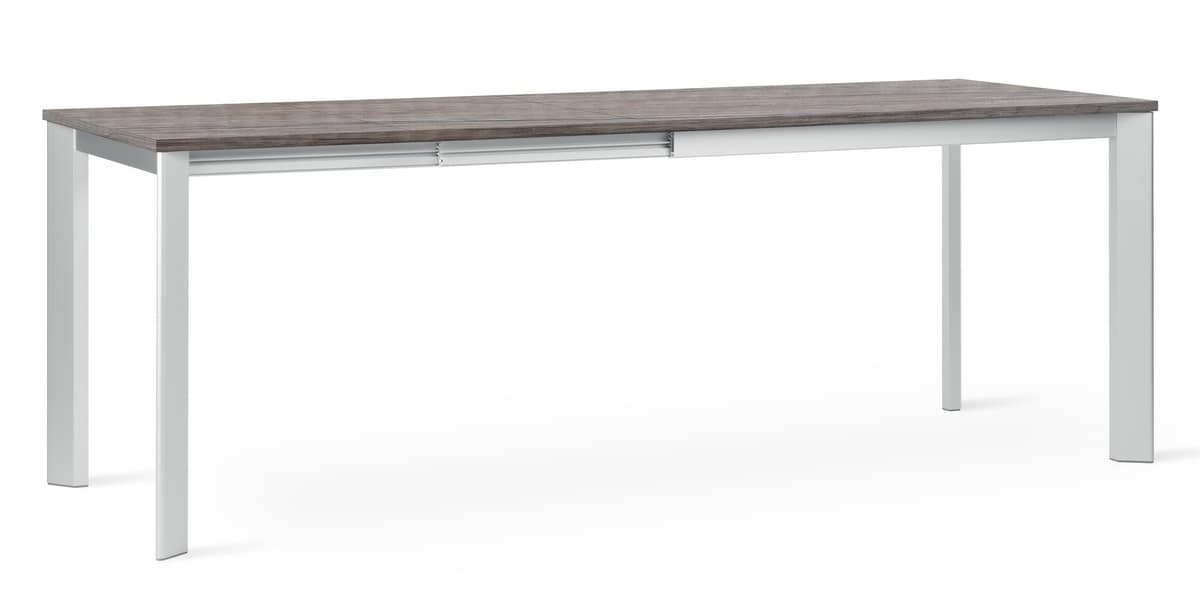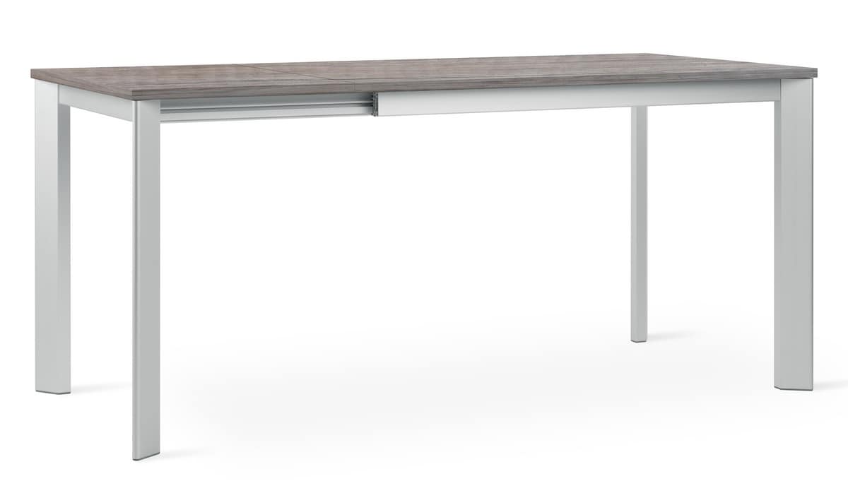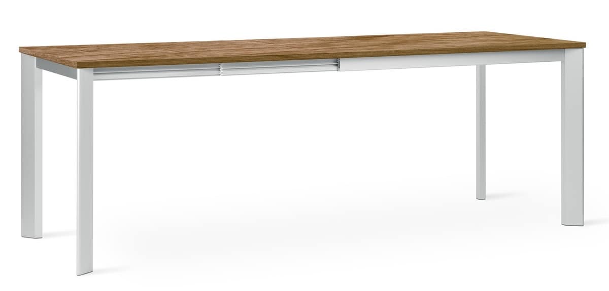 Similar productsA laterally extendable metal table featuring legs in epoxy aluminiun. Equipped with a top 160cm long, at need, thanks to the sturdy guides in aluminium and the two extensions located inside the frame it can be transformed into a 260cm long table. The top and the extensions are offered in melamine covered with dark canyon oak or natural canyon oak. An important and modern table.