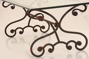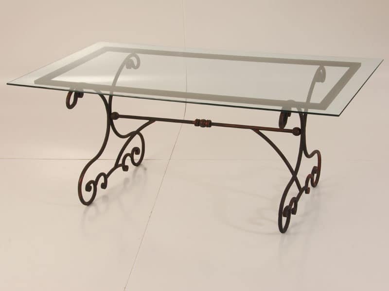 Rectangular table with wrought iron structure and glass top. This table is suited for outdoor environments.